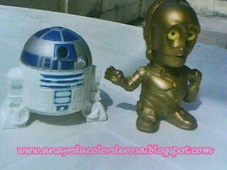 Hace muchisimo que no iba a un mercado... y hace unos días que fui me encontré aparte de muchas cosas mas,,, unos personajes a los que no me pude resistir... tengo varias película favoritas pero dos que amo y super amo...son star wars y rocky... (todas) digo no soy super fan.. como los verdaderos.. que dios mio ,, viven por ellos...pero mas o menos y bueno me encontré a c3p0 y r2d2 en minis a de los que salieron en mcdonalds hace como 4 años... ... no lo pensé ni 2 veces para traermelos...